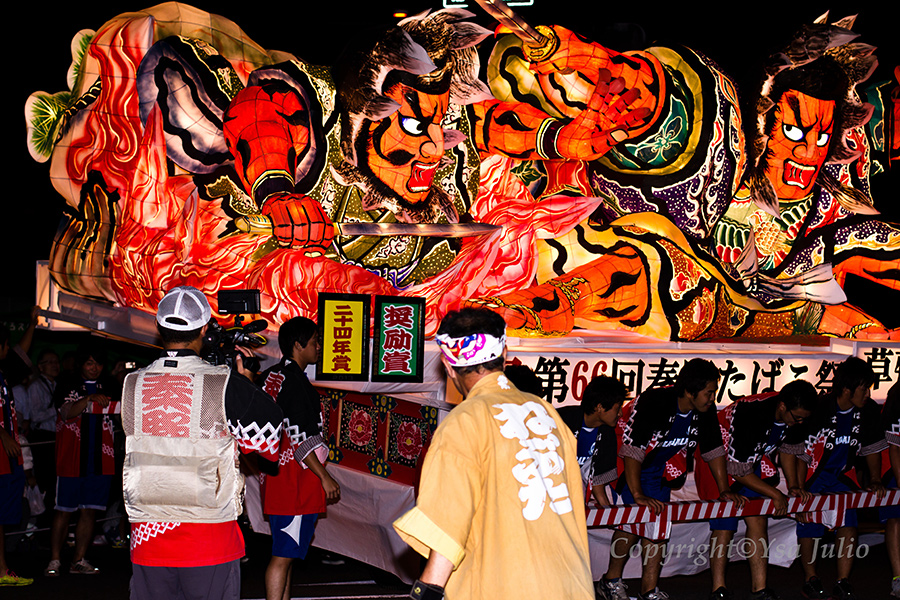 De manera que “tabako” es solo el nombre de la fiesta, ya que en todo mi recorrido por el evento no vi a nadie sujetando un solo cigarro ni nada alusivo al mismo, por el contrario es una fiesta pensada para la familia, chicos y grandes, japoneses y extranjeros, para todo aquel que tenga ganas de divertirse al máximo. Por todos lados hay eventos, danzas típicas como el Awaodori 阿波踊 (explicada anteriormente en “La danza de los tontos” por Eduardo Azato); desfiles como el Aomori Nebuta (青森ねぶた), cuenta la historia que el Nebuta fue una especie de grandes guerreros flotantes cargados de ira en papeles pintados que al ser elevados en el aire y de noche parecían gigantes que atacarían implacablemente; también el desfile de las linternas (らんたん巡行), una especie de cajas enormes iluminadas con dibujos muy llamativos, preparadas por las escuelas de la zona; la fiesta termina con un gran espectáculo de fuegos artificiales, uno de los cuales se realiza en medio del río Mizunashigawa (水無川), es un río que la mayor parte del tiempo carece de agua.